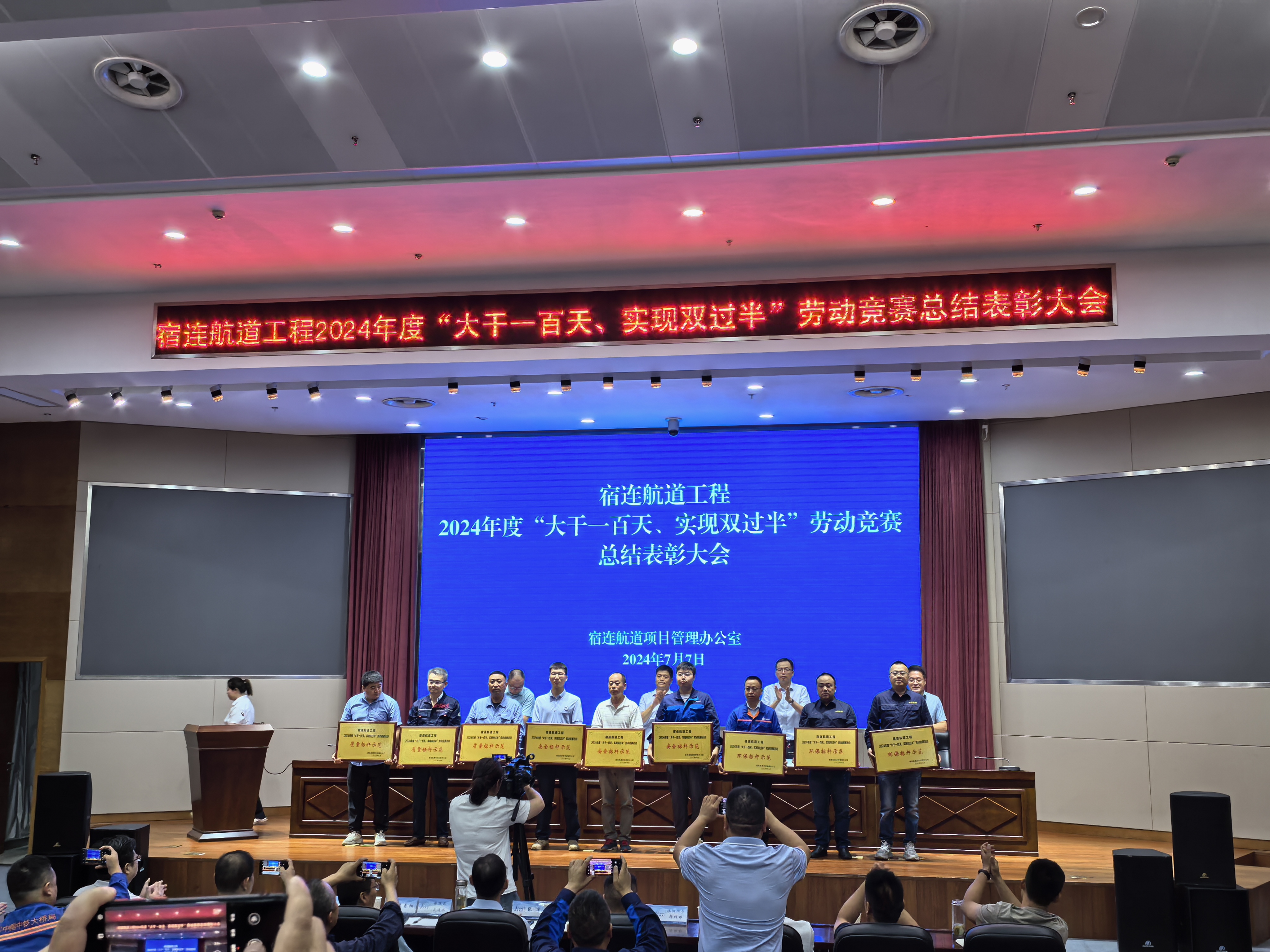 7月7日,宿遷市航道重點(diǎn)工程建設(shè)指揮部召開宿連航道工程2024年度“大干一百天 實(shí)現(xiàn)雙過半”勞動競賽總結(jié)表彰大會。由江蘇交工承建的宿連航道二期5標(biāo)在勞動競賽中表現(xiàn)出彩,屢創(chuàng)佳績,捧回四項(xiàng)榮譽(yù)。